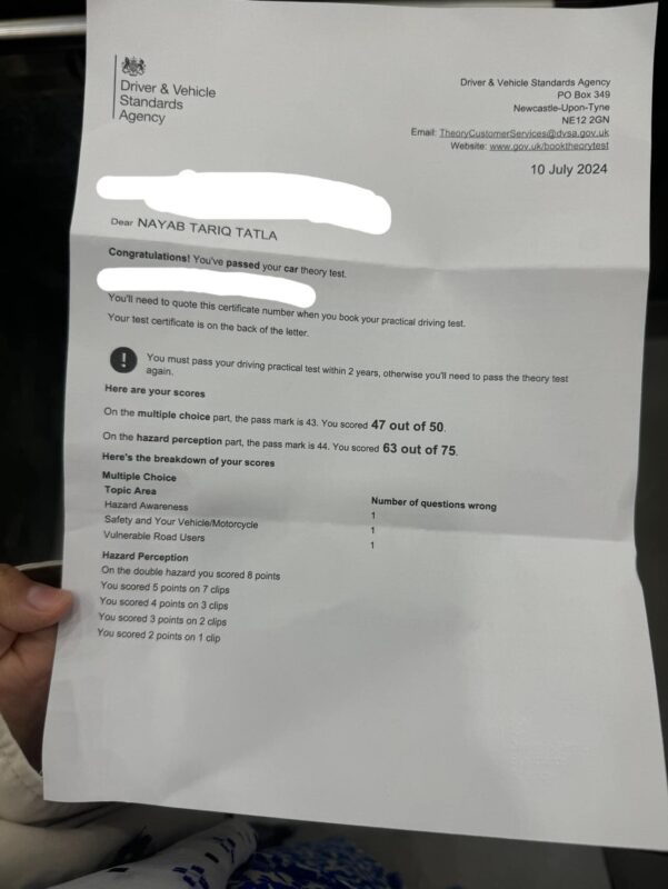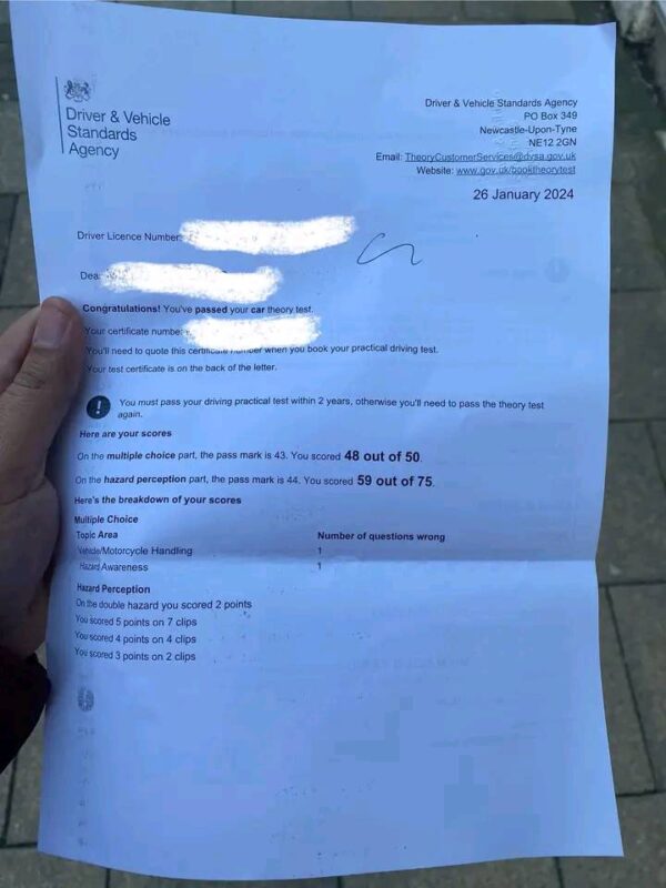Once you pass, you will receive a theory test pass certificate. This certificate is proof that you have successfully completed the theory exam and is required when booking your practical driving test.